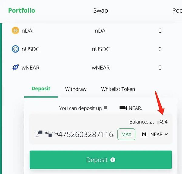 如上图箭头所示,可以通过下拉菜单找到可以存入的资产,值得注意的是,你存入NEAR时,将自动转换为wNEAR,当你取现withdraw时,自动取回NEAR。