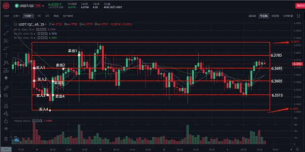在2月4日到2月7日之间,USDT/QC的价格一直在6.3425元-6.3875元之间来回震荡。这种行情是特别适合网格交易的,而且由于这两个币种都是稳定币(目前中币是唯一支持这两种稳定币交易的平台),发生单边行情的概率是很低的。