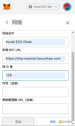 2.设置参数并保存即可 ,网络名称:Huobi ECO Chain