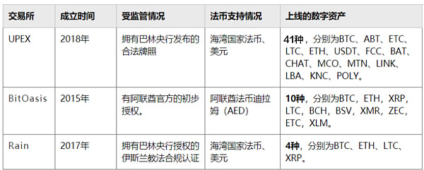 在交易所方面,韩国人口5100万,当地有14家数字货币交易所,而中东拥有4.6亿人口,正式上线运营的交易所一只手就能数得过来。其中三家主流交易所分别是拥有巴林合法牌照的UPEX、位于迪拜的BitOasis、获得巴林央行许可的Rain。