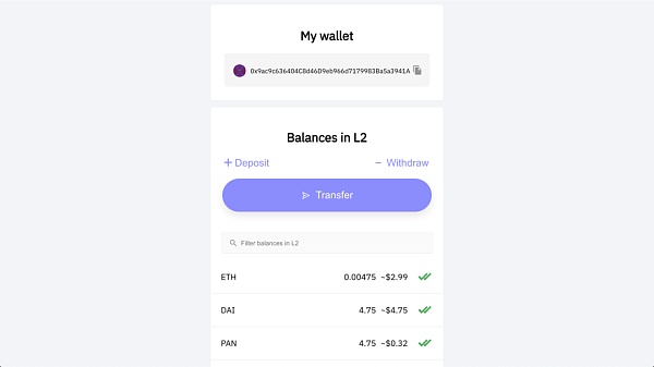 点击 ”Sign“,页面将进入你的 Layer2 钱包账户页面,默认为 ”My wallet“ 分页:? ? ? ??