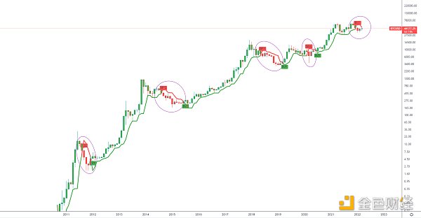 1900/1/1 0:00:00从长期趋势指标线看,上月BTC收线仍未有效跌破,本月以指标线为支撑迎来超跌反弹,而历史上前几轮熊市均是月线跌破,然后向上回抽至该线附近确认后再次回调进入熊市.