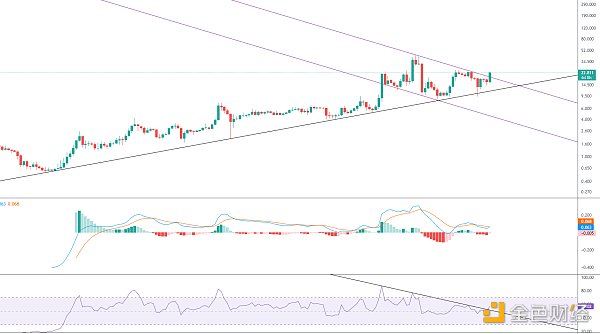 OKB大方向沿趋势线一路震荡向上,每次靠近支撑线均为低吸机会,目前价格尝试突破前期5月见顶下降通道压制,MACD快慢线水上即将2次金叉,RSI突破维持8个月的趋势线压制,预示后面有望迎来新一轮趋势行情,有效突破可适量低吸,支撑19美金一带,后面站上25美金,大双底确立,后面不排除上攻历史前顶的可能。