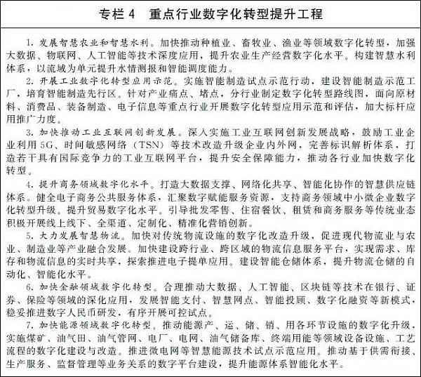 (二)全面深化重点产业数字化转型。立足不同产业特点和差异化需求,推动传统产业全方位、全链条数字化转型,提高全要素生产率。大力提升农业数字化水平,推进“三农”综合信息服务,创新发展智慧农业,提升农业生产、加工、销售、物流等各环节数字化水平。纵深推进工业数字化转型,加快推动研发设计、生产制造、经营管理、市场服务等全生命周期数字化转型,加快培育一批“专精特新”中小企业和制造业单项冠军企业。深入实施智能制造工程,大力推动装备数字化,开展智能制造试点示范专项行动,完善国家智能制造标准体系。培育推广个性化定制、网络化协同等新模式。大力发展数字商务,全面加快商贸、物流、金融等服务业数字化转型,优化管理体系和服务模式,提高服务业的品质与效益。促进数字技术在全过程工程咨询领域的深度应用,引领咨询服务和工程建设模式转型升级。加快推动智慧能源建设应用,促进能源生产、运输、消费等各环节智能化升级,推动能源行业低碳转型。加快推进国土空间基础信息平台建设应用。推动产业互联网融通应用,培育供应链金融、服务型制造等融通发展模式,以数字技术促进产业融合发展。