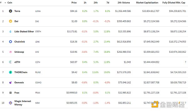 DeFi项目锁定资产前十排名及锁仓量 数据来源:defillama