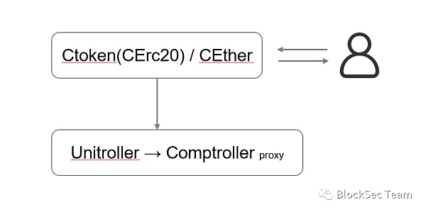 用户与Compound的交互接口主要是CToken/CEther合约(这些合约本身就是一种代币), CToken 相当于 Compound这一平台的"入场券"。通过向不同CToken合约质押其底层代币(underlying token)便可以获得相应的CToken