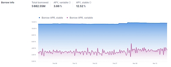 AAVE 上的可变利率(紫色)和固定借款利率(蓝色)