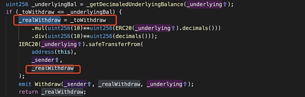 从下面的 withdraw 函数中可以看出最终的提现数量是通过 _withdraw 进行计算得出的