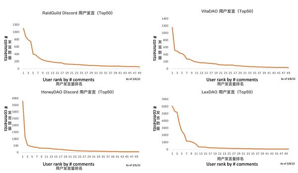 Discord 活跃数据的调查结果呈现指数衰减趋势:排名最高的少数用户的发言比其他所有用户都高得多。以下图表中的数据分别来自四个以扁平化架构为建设目标的 DAO:RaidGuild,Web3 产品设计和开发组织;HoneyDAO,去中心化风险投资组织;VitaDAO,长寿科学家和爱好者组织;以及 LexDAO,律师 - 工程师组织。这些图表显示了社区成员在 Discord 上的活跃情况: