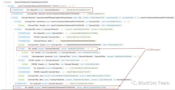 从图中的第2、3个红框可以看到,用户调用该特殊的移除流动性的函数后,Pair转给Router02的钱仅约为2.6e16 wei(不到1美元),而Router02转给用户的钱却约有6.9e23 wei,即纯获利Fei约69万个。而产生差距如此巨大的原因就在于Router02中本来就有将近这么多钱(见第1个红框)。(图中可以看到Fei在transfer的时候调用了对应的Incentive函数,感兴趣的朋友可以自行查看交易。图源https://tx.blocksecteam.com/)