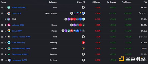 DeFi项目锁定资产前十排名及锁仓量 数据来源:defillama