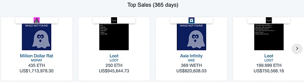 而在其它非元宇宙概念的游戏方面,Loot、Axie Infinity、Gods Unchained等NFT游戏占据了游戏类NFT成交TOP榜的90%,而今年成交价最高的则是Million Dollar Rat的NFT,售价为171.3万美元。