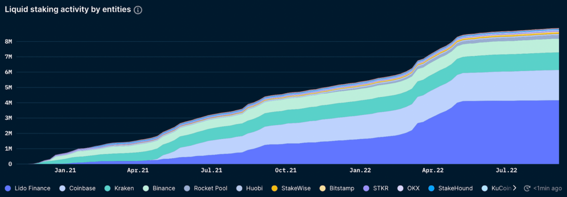 如果合并按计划进行,随着合并执行风险的降低,每月质押的 ETH 可能会增加。 鉴于目前抵押的 ETH 数量相对较少,流动性抵押衍生解决方案应该会从这种信心的增加中受益。 然而,这也取决于市场状况,如果加密货币情绪进一步恶化,积极影响可能会被抵消。 人们对将质押的 ETH 集中在少数实体的风险提出了担忧——这种情况似乎已经在某种程度上发生了。