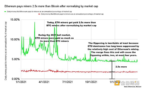历史上,ETH 矿工的收入比比特币矿工高很多。如果两条链的成本结构互换,即如果 BTC 矿工的收入与 ETH 矿工的收入相同(反之亦然),或者如果合并在两年前就已经准备好了,我认为 the Flippening 可能已经发生了。