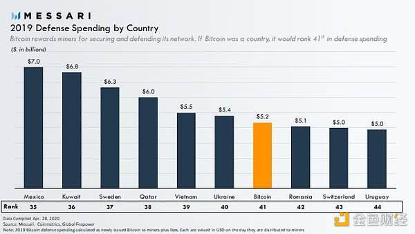 根据瑞安·沃特金斯(Ryan Watkins)的最新观察,比特币在2019年向矿工支付了超过52亿美元,以保护其网络。 矿工和算力是比特币网络抵御黑客攻击的强大防线,沃特金斯将这笔用于网络安全的巨额费用等同于一个国家的年度国防支出。 根据Messari Crypto高管的说法,如果比特币是一个国家,那么就其年度国防支出而言,它将位居全球第41位。