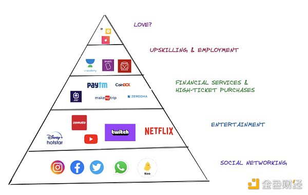 消费模式几乎在非常宽松的意义上遵循马斯洛夫的层次结构。在这种情况下,人们从满足他们的基本需求开始——一个可以花费他们注意力的地方。然后,沿着弧线往上走,为交易和储蓄提供金融服务,还有一小部分向教育或提高技能的方向发展。我尝试根据上述数据制作马斯洛夫的需求层次结构。