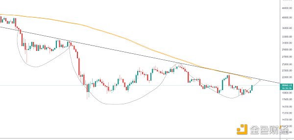 上周已提示,后面大变盘的时间不远了,可以看到BTC再次回升至20000上方,日线后续将有望再次上攻下滑趋势线和下降压制线,目前点位区间21500-21800,每日随着时间还在下滑,这一带也是周线压力区,观察能否有效突破,一旦突破站稳,一个大级别头肩底形成,后面将有望展开第二波段反弹,前面第一波最高涨至25200见顶回落。