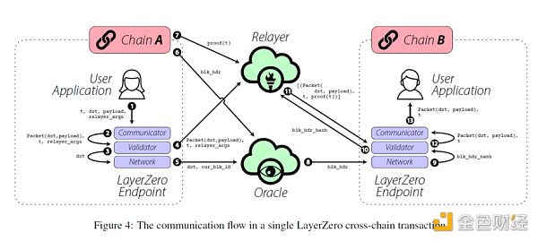 Endpoint 是一个部署在链上的合约,负责提供消息的发送与接收。Relayer 和 Oracle 功能职责是一致的,都是发挥预言机的功能,不过传输的内容有所不同,两者相互独立运行,再由接收链的 Endpoint 对 Relayer 和 Oracle 发送来的信息进行验证与匹配,提高 LayerZero 的安全冗余性。