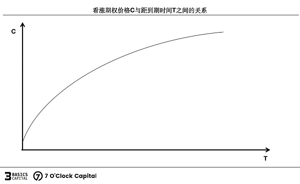 到期周期时间越久,看涨期权的价格越高。例如,当前的某代币价值2000美元,而无风险利率为0,无论多久后代币价格的期望值都是2000美元。对于看涨期权的买方2000美元以下将不会行使兑付,亏损固定为买入期权的资金;超过2000美元将收益无限放大。因此到期日越长,涨到3000美元的概率增加,收益也就增加。虽然跌至1000美元的概率和涨到3000美元的概率一样,但是跌更多不会增加亏损。
