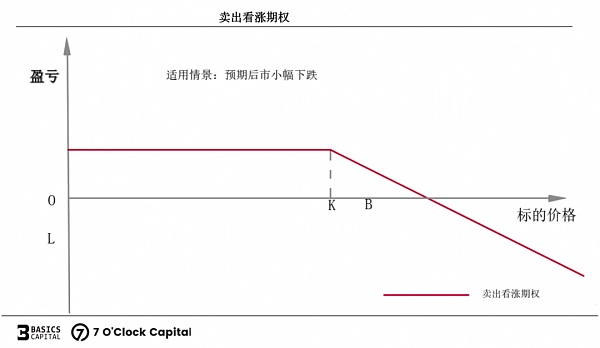 它是一种纯粹方向性的看空投机策略,为从标的下跌中获利。当价格上涨时,卖出看涨期权与卖出期货亏损相同,但权利金可以弥补部分损失,在盘整或价格波动不大时,仍可以获得收益。