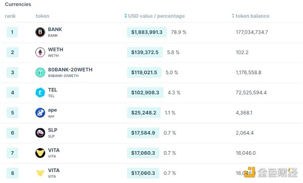 虽然 BANK 占 DAO 国库的 80%,但整体比上面的例子更加多样化。不过 Banklss 国库并未持有稳定币,如果出现黑天鹅事件,BanklessDAO 维持项目的购买力会大幅下降。