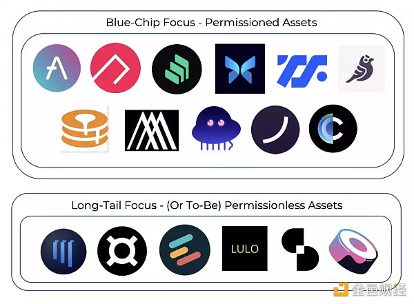 对比蓝筹资产与长尾资产借贷,目前蓝筹资产几乎占据了所有的流动性。Euler 是比较知名的、专注于长尾资产的协议,但它的 TVL 只有不到 5% 是属于长尾资产的,这主要是由于质押 Token 带来的机会成本。