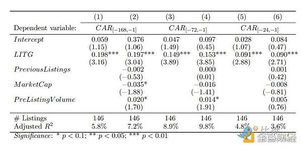 为了检验异常上涨的统计显著性,我们回归了范围[-24,-1],[-72,-1]和[-168,-1]内的累计异常收益(CAR),以小时衡量相对于上币公告(时间0),即对应上币公告前1,3和7天,关于LITG的虚拟变量和一组控制变量:
