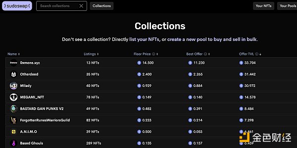 另外,sudoswap 官方称,由于收费,NFT 的市场结构效率低下。买家通常需要涨价 10% 才能达到收支平衡。但在 sudoswap 上进行交易意味着买家只需支付 0.5% 的费用(sudoswap 取消了交易版税),而在其他平台上通常需要支付 7.5%(2.5% + 5% 版税)费用,从而更好地发现价格。