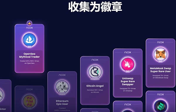 Noox Badge是该应用中的可编程的链上成就不可转让类NFT,它用纯文本和图形、图像,奖用户在区块链上「做了什么」实现可视化,例如在OpenSea上交易,为Uniswawp提供过流动性,在Gitcoin捐过款,注册了ENS域名,只要底层数据记录在链上,这个NFT就可以代表链上动作。