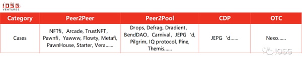 一般地,我们可以将目前市面上的 NFT 抵押借贷解决方划分成点对点(P2P), 点对池(P2Pool),抵押债仓(CDP)和场外借贷(OTC)四类: