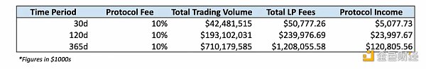 为所有的矿池打开费用开关似乎不切实际,但是如果实验成功,Uniswap 很有可能会选择打开更多的费用开关,而且 DEX 在其平台上从每笔交易中赚取费用是惯例。通过计算,我们可以更好地了解 Uniswap 潜在的盈利能力上限。