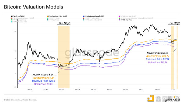 已实现价格目前为 21.7k 美元,而现货价格略低于已实现价格为 21.3k 美元。在 2018-2019 年熊市期间,价格在已实现价格以下波动了 140 天,使得目前 36 天的熊市持续时间相对较短,因此这表明可能需要更多的积累时间。