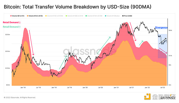 通过分析小额交易的长期趋势,可以衡量散户投资者在网络中的存在。下图显示了美元价值低于 1 万美元的交易总量的 90 天移动平均值。