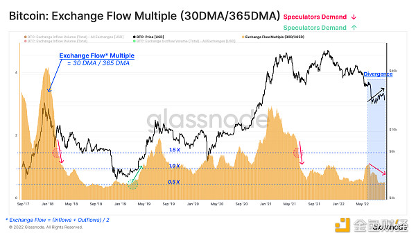 交易所流量倍数可用作一个阈值水平,可用于绘制熊市的早期?和后期??。与之前讨论的图表一致,近期价格从 2022 年 6 月的底部反弹?,并没有伴随大量投机者涌入市场。