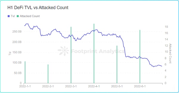 从整个加密货币市场上半年行情走势来看,DeFi、NFT、GameFi等各大赛道发展总趋势都是持续走低。整个DeFi总锁仓量从1月初的2798亿美元跌到了6月末的824亿美元,半年下跌70.5%。分析发现,黑客攻击事件频率与市场行情走势呈现出一定的关联性。五六月份在TVL大幅缩水的情况下,黑客攻击事件相对于前几个月有所减少,更多的链上资金会吸引更多黑客的目光。