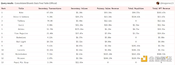 DuneAnalytics 统计的品牌 NFT 收入情况