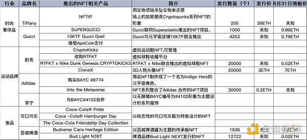 相比今年第一季度,NFT 的相关数据表现有所下降,但项目数量、用户整体活跃度较去年同期已经是质的飞跃。有了这样一个基础市场,传统消费品牌开始放弃围观姿态,纷纷布局 NFT。