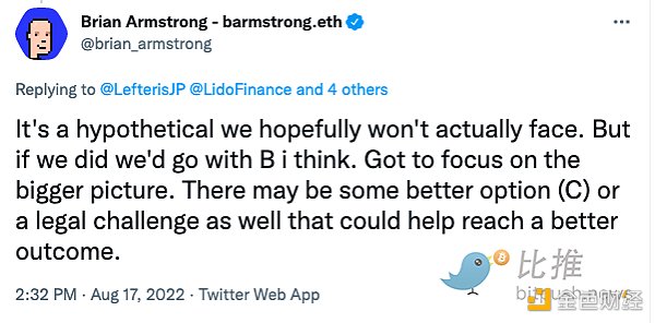 三天后,Armstrong回复道:“这是一个我们希望不会真正面对的假设。但如果我们真的面对了,我认为我们会选择 B。我们必须着眼于更大的图景。可能会有更好的选择 (C) 或法律挑战帮助达到更好的结果。”