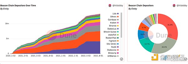 加密人士担心的是,中心化实体未来可能最终被迫在以太坊网络协议级别审查交易。一些社区用户担心 Coinbase 可能会在监管压力下屈服,将某些交易排除在以太坊的新区块中。根据 Dune Analytics数据,Coinbase 将成为第三大以太坊验证者,占所有质押 ETH 14.7% 以上的市场份额。