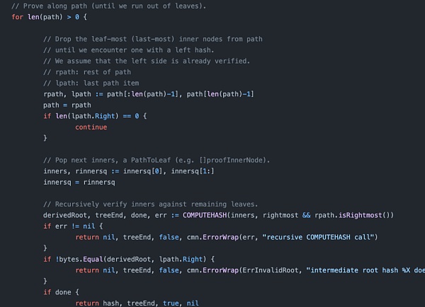 3. ComputeRootHash 将通过 leaf hash 与 rest path(innernode) 进行递归 hash 并检查是否与 last path node 的 right 一致。
