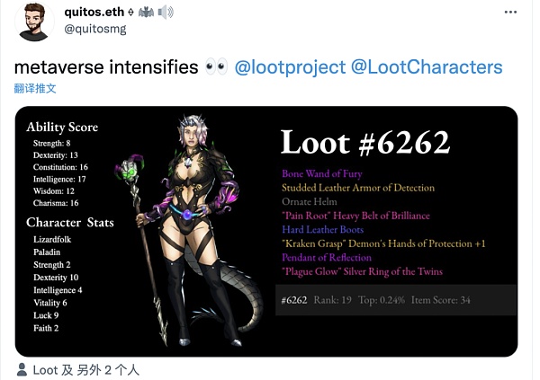 Loot是随机生成的冒险者装备,并存储在区块链上。统计数字、图像和其他功能被有意省略,供他人解释。