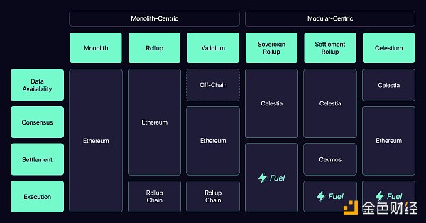 Fuel 与 Celestia 是孪生姐妹。不同的是,Celestia 针对 DA 和排序进行了优化,只处理数据可用性和共识,而 Fuel 的定位则是模块化执行层。