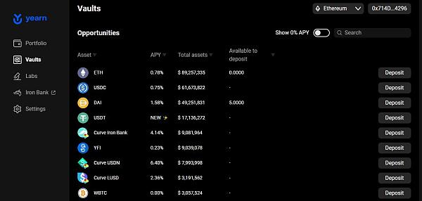 它主要产品是 yVaults,投资者可以在其中存入资产以获得长期的回报(收益)。他们有大量可用资产(超过 100 种)可供选择,投资者可以通过 APY(年化收益)、总资产(每个 Vault 的 TVL)或钱包中可用的资产来过滤他们的搜索。