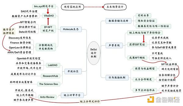 关于Molecule生态:Molecule建立在模块化的开放堆栈上,利用各种 DeFi(Balancer、Gnosis)和治理组件(The LAO、Moloch)以及法律框架(OpenLaw)来搭建自己的生态。在上述这些功能之外,通过Molecule Discovery还可以进行资产采购、资产评估并且包含临床数据托管等基础设施。Molecule并不局限于自身网站的基础功能,而是建立了完善并且庞大的生态系统,使患者集体和药物开发 DAO 能够通过 NFT 持有、治理现实世界的 IP 并与之交互,加上在IP-NFT方面的创新(例如通过将NFT集成到去中心化拍卖系统和 AMM(如 Balancer、Uniswap 或 Sushi)中的资金框架),有人认为Molecule更像是DeSci赛道的OpenSea,但在笔者看来,宏观上Molecule坚持播种新的DAO和旗下DeSci项目,包括VITA DAO(第一个生物技术DAO)ValleyDAO AthenaDAO HairDAO等,不仅帮助推进早期药物开发的资金,也从前中端同时帮了DeSci的发展,如搭建DeSci赛道基础设施如bio.xyz(DAO的launchpad)。Molecule的生态正在逐步完善,布局宏大,我们有理由相信Molecule在未来将成为DeSci概念的领军项目。