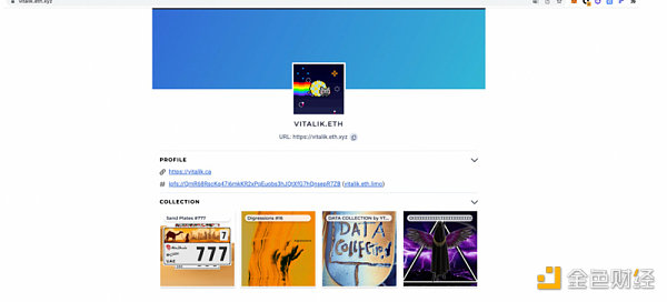 虽然“vitalik.eth”不能够直接被输入浏览器中被解析,但如“vitalik.eth.xyz”“vitalik.eth.link”就可以。读者不妨也试一试,比如往浏览器中输入“vitalik.eth.xyz”,就可以看到Vitalik默认生成的ENS Profile;输入“vitalik.eth.link”,就可以看到Vitalik的个人主页: