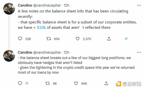 Alameda联席CEO Caroline Ellison回应Coindesk调查:关于最近流传的资产负债表信息的一些注释:特定的资产负债表是针对我们公司实体的一个子集,我们有超过100亿美元的资产没有反映在那里。资产负债表列出了我们最大的几个多头头寸;我们显然有未列出的对冲——鉴于今年加密信贷空间收紧,我们现在已经归还了大部分贷款。