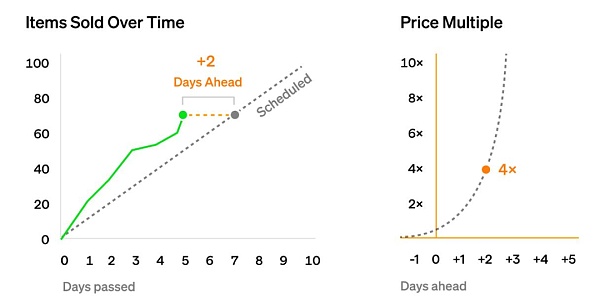 假如在第 15 天,我们应该卖出 150 个 NFT,但只卖了 120 个,这是第 12 天应该完成的发售量,这意味着发售情况落后了三天。于是将价格调整为 2 的 -3 次方,即新价格是 0.125 个 Token,降低价格来促进 NFT 的售出。