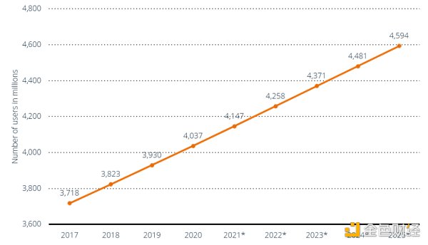 作为 Web3 邮箱设计原型的传统电子邮箱,可以算是当今互联网上存活时间最久的通信手段之一:目前仍在使用的主要协议标准最早出现在 1980 年代,而电子邮件的原型甚至可以追溯到 1972 年。据 Statista 统计数据显示,截至 2020 年,世界范围内共有超过 40 亿的邮箱用户,超过世界总人口的 50%,并依旧保持着 3% 的年增率。