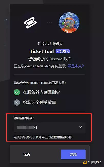 具体使用步骤如下:邀请机器人加入 Discrod 服务器。选中需要加入的服务器,点击继续。