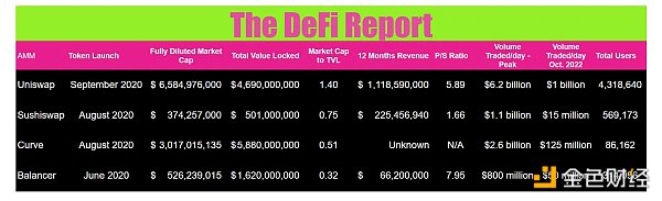 目前,Uniswap 的平均交易量约为 10 亿美元/天。其交易量曾在一天内飙升至 65 亿美元,并在今年 5 月总交易量超 1 万亿美元。下面是与其他几个以太坊 AMM 的快速比较。请注意,替代 L1 链上的 AMM 也在不断增长。